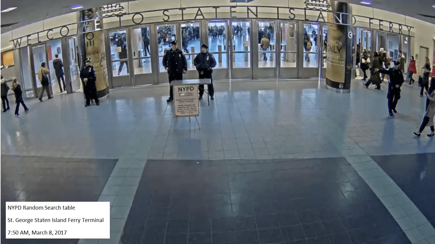 At least since 9/11, along with stop and frisk, the NYPD often sent officers to randomly search people. These are not fixed police posts or times; when the brass decides, they send the officers, with a folding table and a sign, to a subway station near you, or in this case, the ferry terminal.